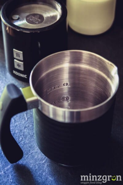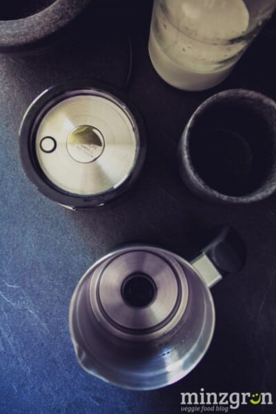 Reis-, Hafer- und Kokosnussdrinks sind demzufolge schon mal so gut wie raus. Richtig gut schäumen lassen sich beispielsweise Soja-, Mandel- und Cashewmilch. Wer pure Sojamilch nicht mag (wie ich), kann sie aber auch mit einer anderen Milch mischen. Neuerdings findet man aber auch spezielle „Aufschäum“-Drinks, sogenannte „Barista“ Editionen zwischen den schon reichlich vorhandenen Pflanzendrinks in den Regalen.