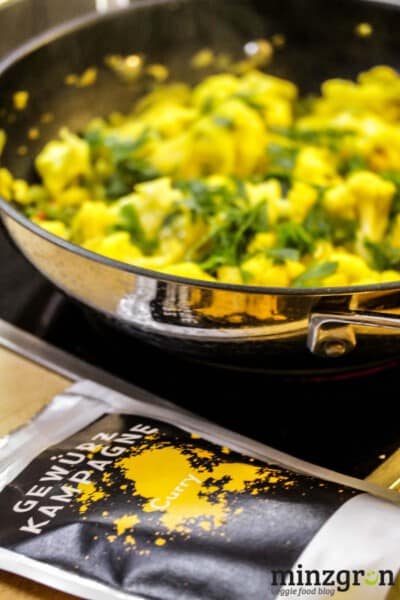 Komisch eigentlich, wenn die fernöstliche, süße Mango und der knackige Blumenkohl vom Feld um die Ecke nebeneinander im Supermarkt liegen, als wäre es das normalste der Welt. Kurz: ich habe gar nicht lange überlegt und beide in einem milden Curry „wieder“vereint. Der Geruch von frisch angebratenen Zwiebeln, geschwenkt in Currypulver und weißer Blumenkohl, der langsam die sonnengelbe Curryfarbe annimmt – ein fruchtig-scharfes Crossover.