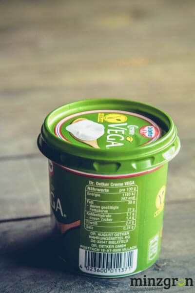 Heute sieht das alles (zum Glück) ganz anders aus: die Regale wurden um Meter erweitert und sind prall gefüllt mit Pflanzendrinks auf Hafer- (mein Favorit!), Mandel-, Reis-, Cashew-, Kokos- und what-so-ever-Basis. Nur Milch darf sie nicht genannt werden, da hat die EU was dagegen! Auch im Kühlregal stehen neben Soja- nun leckere Lupinen- und Kokosjoghurts. Käse und Wurst auf Pflanzenbasis sind nicht nur optisch, sondern auch geschmacklich kaum vom Original zu unterscheiden. Und zwischendrin findet man, ganz unscheinbar, sogar die eine oder andere Überraschung, wie die Creme VEGA, eine vegane Alternative zur Crème fraîche und – wow – von den „ganz Großen“ – Dr. Oetker!