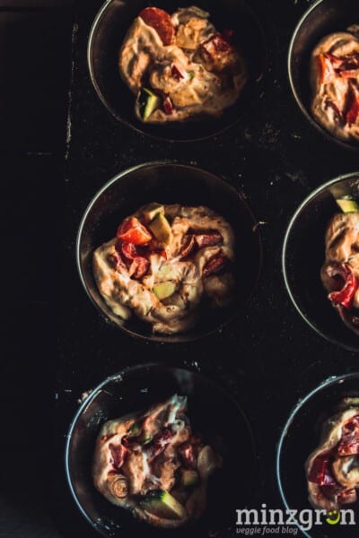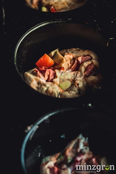 Den Teig nach dem Gehen nochmals durchkneten und auf einer mit Mehl bestreuten, glatten Arbeitsplatte etwa 0,5 cm dick und möglichst viereckig ausrollen. Creme VEGA und Tomatenmark verrühren, mit Oregano, Basilikum, Salz und Pfeffer würzen und den Teig damit bestreichen. Nach Belieben Chiliflocken darüber streuen. Das kleingeschnittene Gemüse auf dem Teig verteilen und diesen vorsichtig zusammen rollen. Ränder gut andrücken. Die Teigrolle abschließend in 10 – 12 gleich dicke Scheiben schneiden und auf einem mit Backpapier ausgelegtem Blech (oder in gefetteten Muffinformen) verteilen. Im vorgeheizten Ofen bei 200°C Ober- und Unterhitze etwa 25min auf mittlerer Schiene backen.