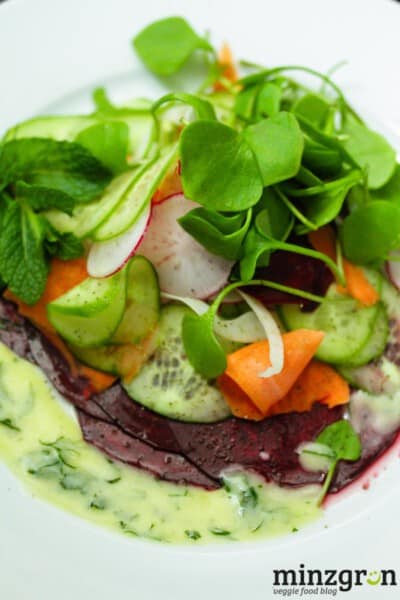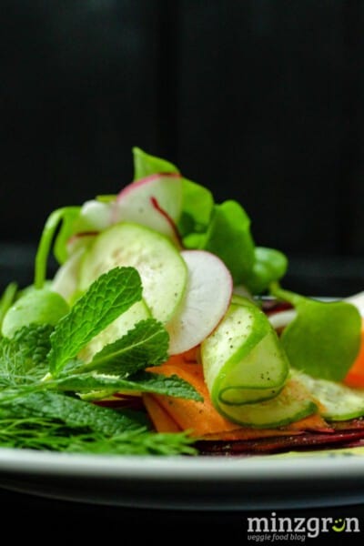 Aus diesem Grund gibt es die Verbraucherkampagne „Deutschland – Mein Garten.“, die den Verbrauchern deutsches Obst und Gemüse näher bringen möchte. Auf der Kampagnen-Website findet man neben vielen abwechslungsreichen Rezepten auch einen sehr schicken und informativen Saisonkalender mit Tipps zu Obst- und Gemüsesorten, deren Lagerung und den Anbaugebieten. Mit dem folgenden Rezept trage ich zu dessen Unterstützung bei – mit einem modernen Klassiker nämlich – benannt nach dem italienischen Maler, der für seine leuchtenden Rottöne bekannt war: Carpaccio. Heute in vegetarischer Form mit dem wahren leuchtend-roten Highlight zu dieser Jahreszeit! Rote Bete gepaart mit all den wunderbaren Gemüsesorten, die sich beliebig variieren und erweitern lassen. Also erfreu dich an all den bunten, saisonalen und regionalen Lebensmitteln und lerne sie zu schätzen! Und wenn bei uns gerade keine Saison herrscht, achte auf die Bioqualität von Importlebensmitteln. Also: knallrote Bete statt Westcoast-Erdbeeren! Real food rules! Here we go: