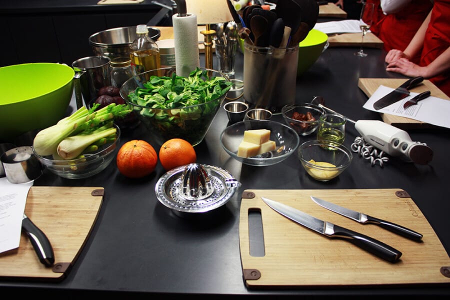 Übrigens war das auch für mich das erste Mal, dass ich bei einem richtigen Kochkurs teilnahm und noch allerhand Tipps & Tricks mitnehmen konnte. Aber von vorn. Nach noch mehr Begrüßungssekt der Begrüßung zog jeder Teilnehmer einen mit einer Nummer versehenen Stein, der für den zuzubereitenden Gang des vier-Gänge-„Genussvoll-Vegetarisch“-Menüs stand. Die bunte Mischung entstand also schon vor dem eigentlichen Kochvorgang. 😉 Damit ich mich ausgiebig mit den so eben frisch zusammengewürfelten Teams austauschen konnte, hatte Profikoch André vom LukullusT ein Auge auf die Zubereitung des Menüs und gab zwischendurch wertvolle Tipps – zum Beispiel wie man die perfekte Vinaigrette zubereitet (die Zutaten verbinden sich nämlich am besten, wenn man sie in ein verschließbares Glas gibt und kräftig von Hand schüttelt – das Öl wird dabei erst zum Schluss dazugegeben). Hierzu lassen sich auch prima kleine Glasflaschen wiederverwenden (Stichwort Upcycling!). 😉