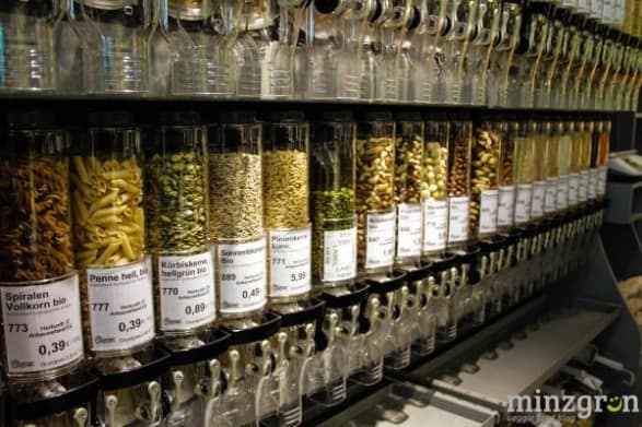 2,5 Millionen Tonnen Verpackungsmüll fallen pro Jahr in Deutschland an. 450 Jahre benötigt eine Plastikflasche, bis sie (zumindest) in ihre Bestandteile zerfällt – biologisch abgebaut werden kann sie von Mikroorganismen trotzdem nicht. Grund genug, lästige Plastikverpackungen einfach wegzulassen und einen großen Teil des Sortiments original, also unverpackt, anzubieten. So lassen sich hier Nüsse in der gewünschten Menge in das eigene Gefäß oder eine Papiertüte abfüllen. Oder man bringt seine Glasflasche mit und zapft sich einen Pflanzendrink an der Milchbar.