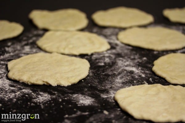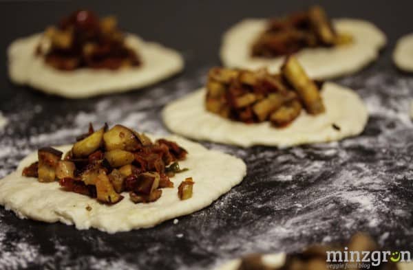 Für den Teig die Kokosnussmilch gut schütteln, umrühren und in eine große Schüssel füllen. Mit Mehl, Backpulver und einer Prise Salz zu einem glatten Teig verrühren. Ist er noch zu klebrig, etwas Mehl dazu geben. Anschließend eine Arbeitsfläche bemehlen und den Teig zu einer dicken, langen Rolle formen. 12 gleichgroße Teile abtrennen, zu Kugeln formen und kreisförmig flach drücken. Sie sollten etwa einen halben Zentimeter dick sein, damit sie später beim Dämpfen nicht reißen. Etwa 1-2 EL der Pilzmischung auf die Mitte der Teigkreise setzen, dabei sollten 2cm zum Rand frei bleiben. Den Teig von außen nach innen zusammenschlagen und vorsichtig fest drücken. Mit der „Naht“ nach unten in starke oder doppelte Papierförmchen legen. Für die Auberginen-Tomaten-Füllung wiederholen.
