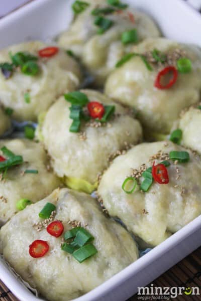 Dim Sum – „kleine Leckerbissen, die das Herz berühren“, vegan und lecker befüllt. Diese gefüllten Teigtaschen habe ich am Silvesterabend gezaubert – nicht nur ein tolles Abendessen, sondern auch ein perfektes Partyfood. Die Kokosnussmilch macht den Teig zudem schön weich und sorgt für einen unwiderstehlichen Geruch beim Dämpfen. Mit den Füllungen und den Saucen kann man sich wahrlich austoben! Ich hab dazu einfach das restliche Gemüse verarbeitet und daraus eine Pilz- und eine Auberginen-Tomaten-Füllung gezaubert. Dazu passt eine cremige Sesamsauce oder eine salzig-scharfe Sojasauce. Super lecker!