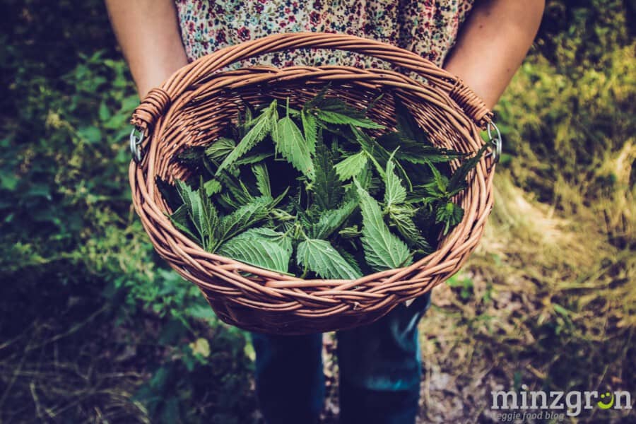 Brennnesseln sind reich an wertvollem Eisen und Eiweiß, wirken blutreinigend und entgiftend. Das wusste schon Oma. Brennnesseln verbinden wir allerdings eher mit roten, juckenden Schwellungen bei Berührung, stimmt’s? Eher nichts wonach man spontan greifen würde, wenn man hungrig ist. Die Brennhaare der Blätter nesseln jedoch nicht, wenn sie nass sind oder von unten nach oben gestrichen werden. Vorsichtshalber mit Handschuhen bewaffnet, knipsen wir mit Daumen und Zeigefinger die oberen vier bis sechs jungen Blätter am Stängel ab und laufen mit einem vollen Korb und hungrigen Mägen zurück zum Auto.